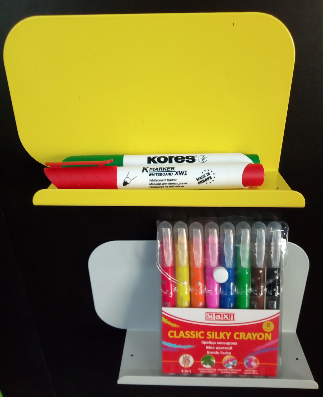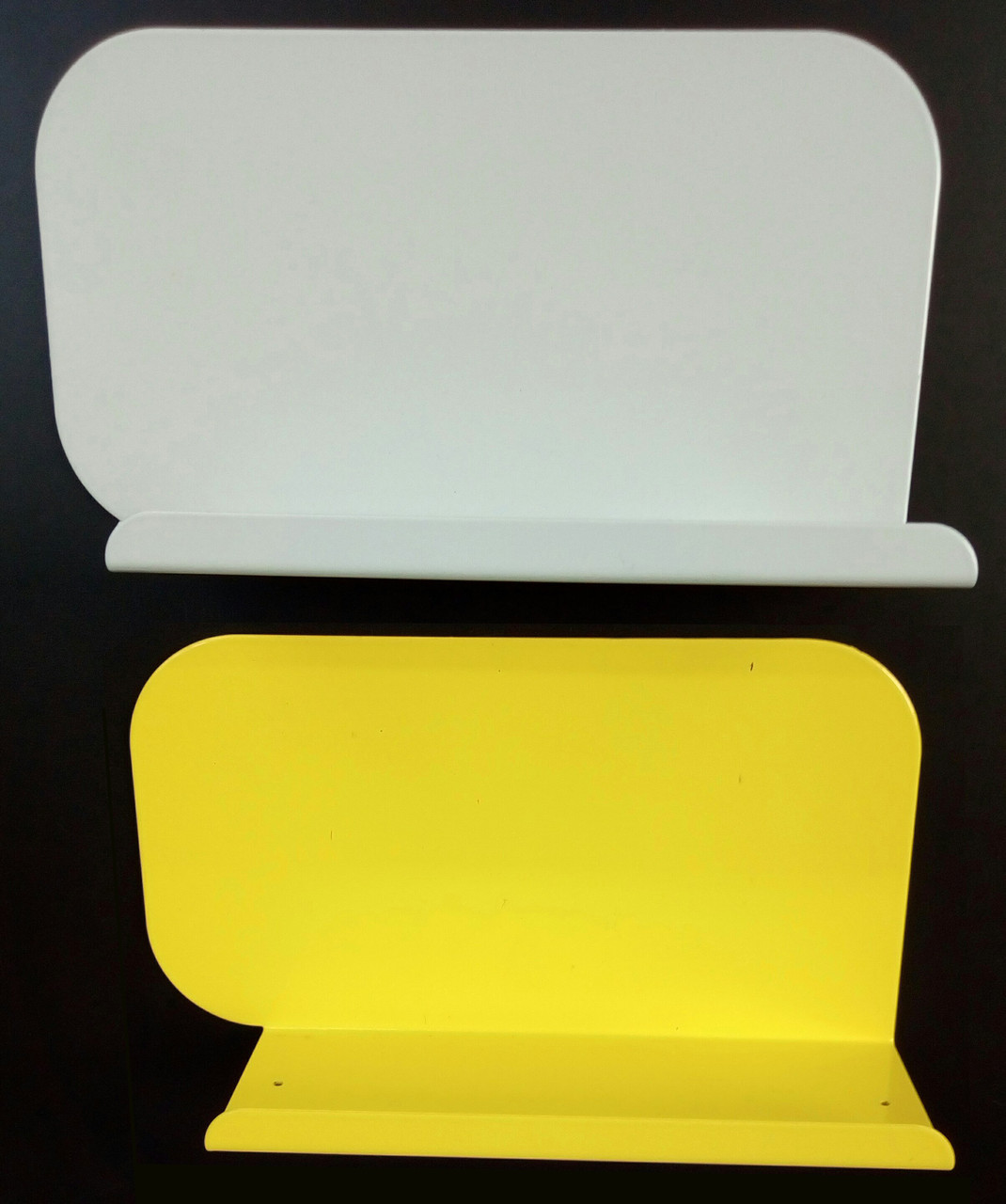 Самі полки також виготовлені з металу і стандартно доступні в двох колірних рішеннях: жовтому і сірому.